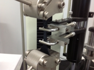 切断時の引張強さ、切断時の伸び、100%(または200%・300%)伸びたときの応力を測定できます。