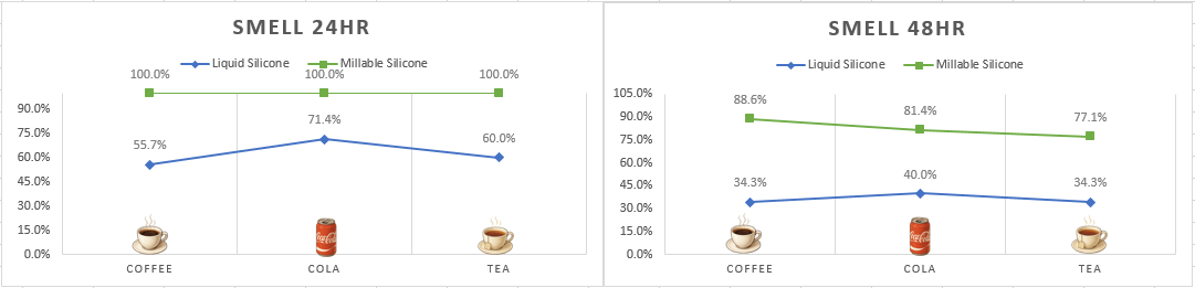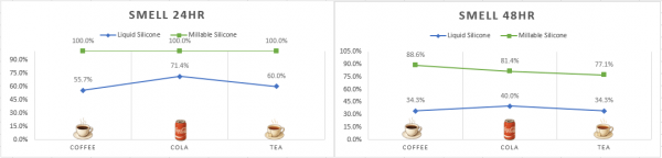 RIKENではミラブルシリコーンゴムと液状シリコーンゴムの臭気比較を行いました。さらに色残りについても写真で公開いたします。